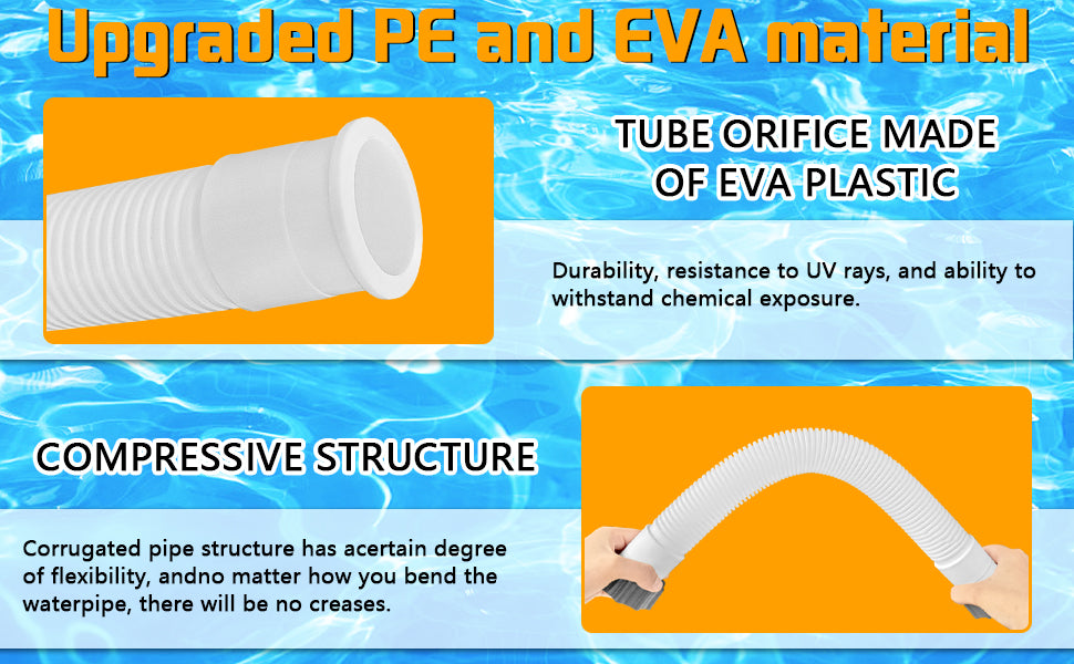 - 【Material】El reemplazo de manguera de bomba de piscina de 1,5 pulgadas está fabricado con material PE y EVA de alta calidad que son conocidos por su durabilidad, resistencia a los rayos UV y capacidad para resistir la exposición química, lo que la convierte en una opción ideal para sistemas de filtración de piscinas. La construcción robusta garantiza confiabilidad a largo plazo y minimiza el riesgo de fugas o grietas.
