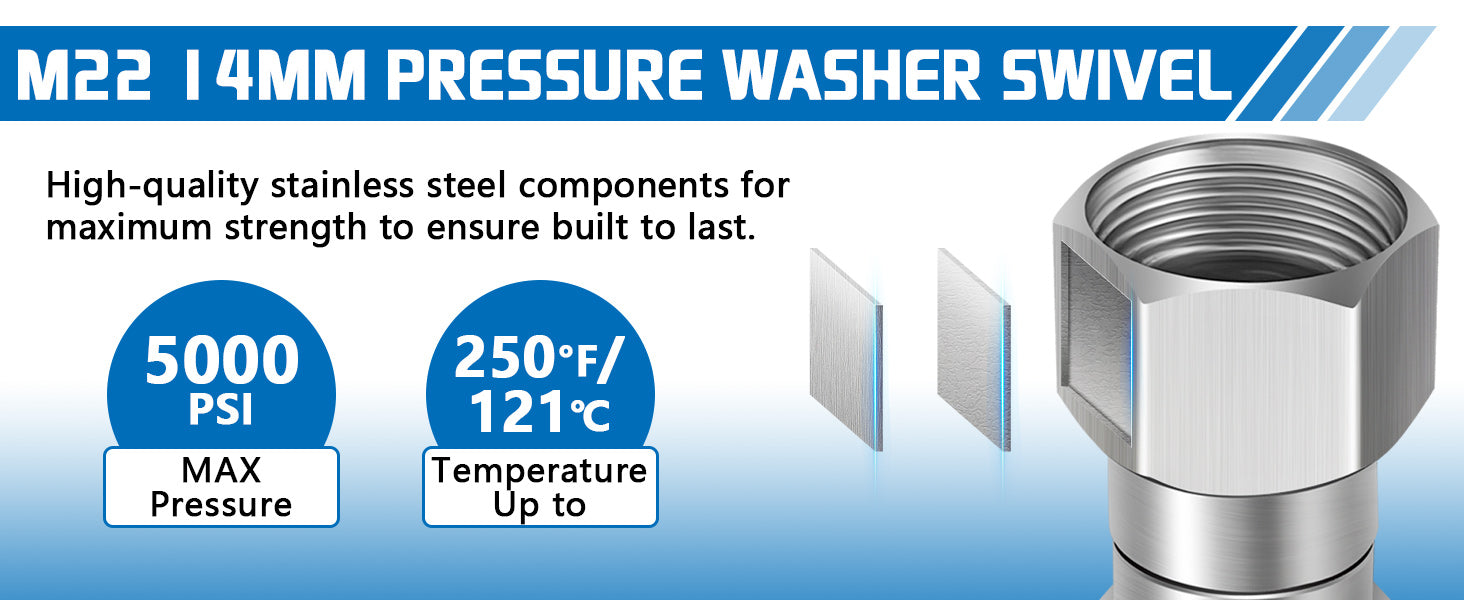 - 【High Pressure】The pressure washer swivel fitting is designed to handle high-pressure applications, with a max pressure rating of 5000 PSI. This high-pressure capability allows for effective removal of dirt, grime, and stubborn stains, providing a thorough and efficient cleaning experience. It is suitable for both commercial and heavy-duty residential use