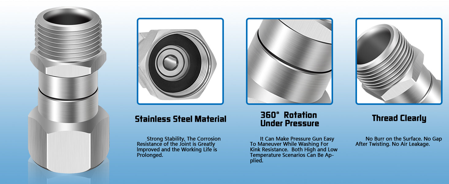 - 【360 Degree Swivel】The pressure washer swivel fitting features a 360-degree swivel design that allows for easy maneuverability. This design enables the pressure washer hose to rotate freely, reducing tangling. It provides enhanced flexibility and improves the overall efficiency of the pressure washer.