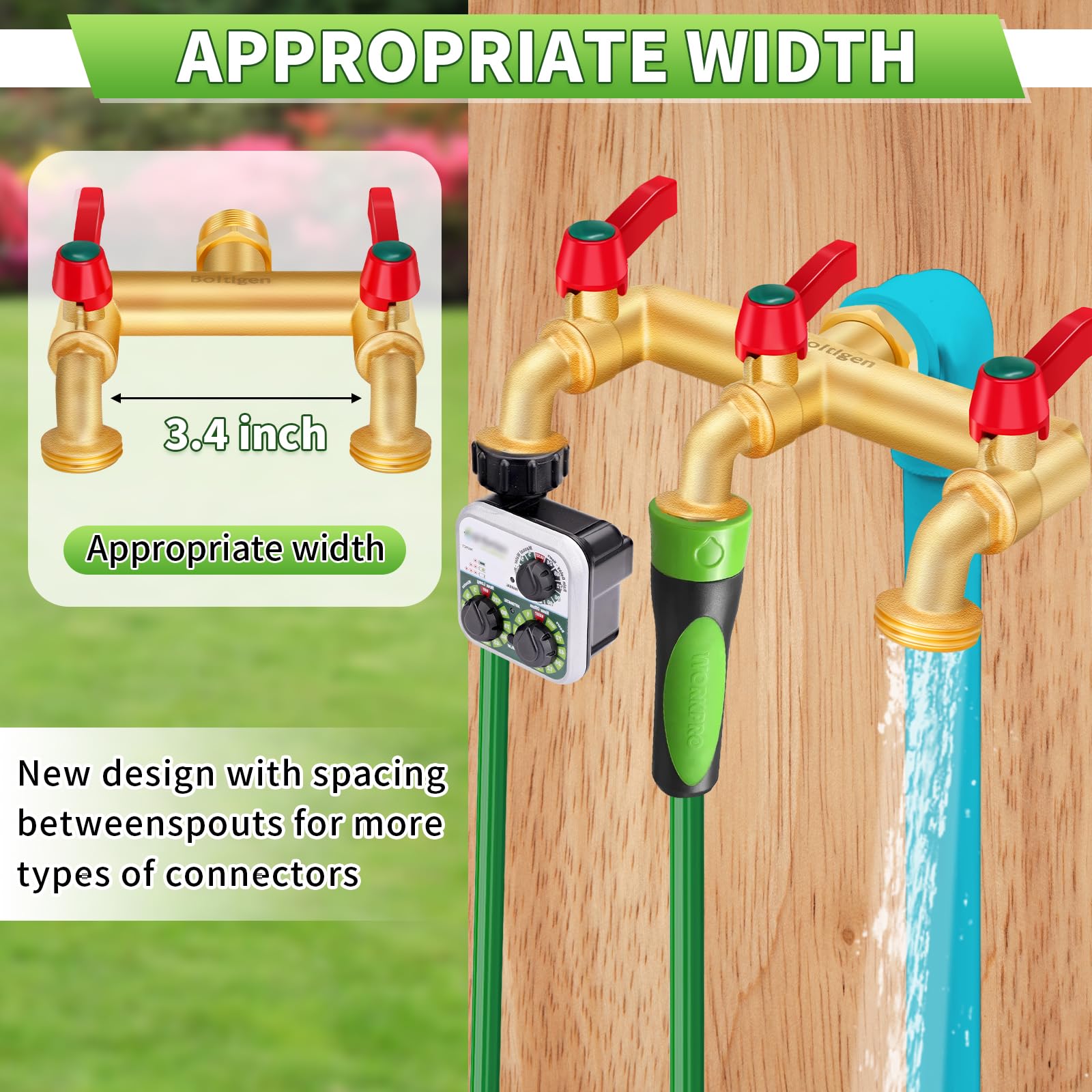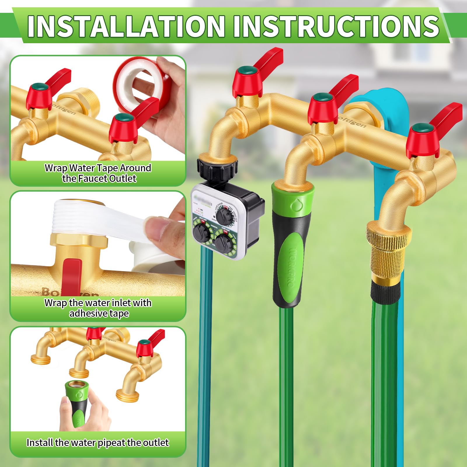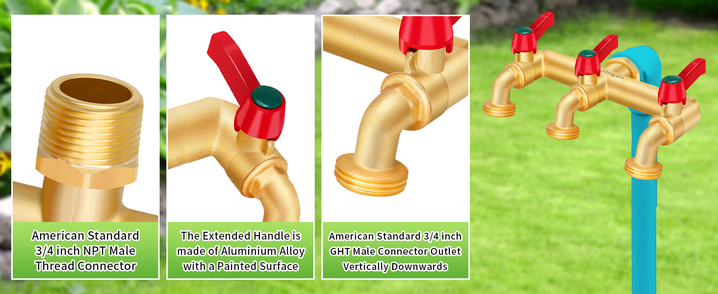 Designed with wider outlet spacing, allowing you to easily install more irrigation timers, providing more options for your garden and making your irrigation system smarter.Water Faucet ?