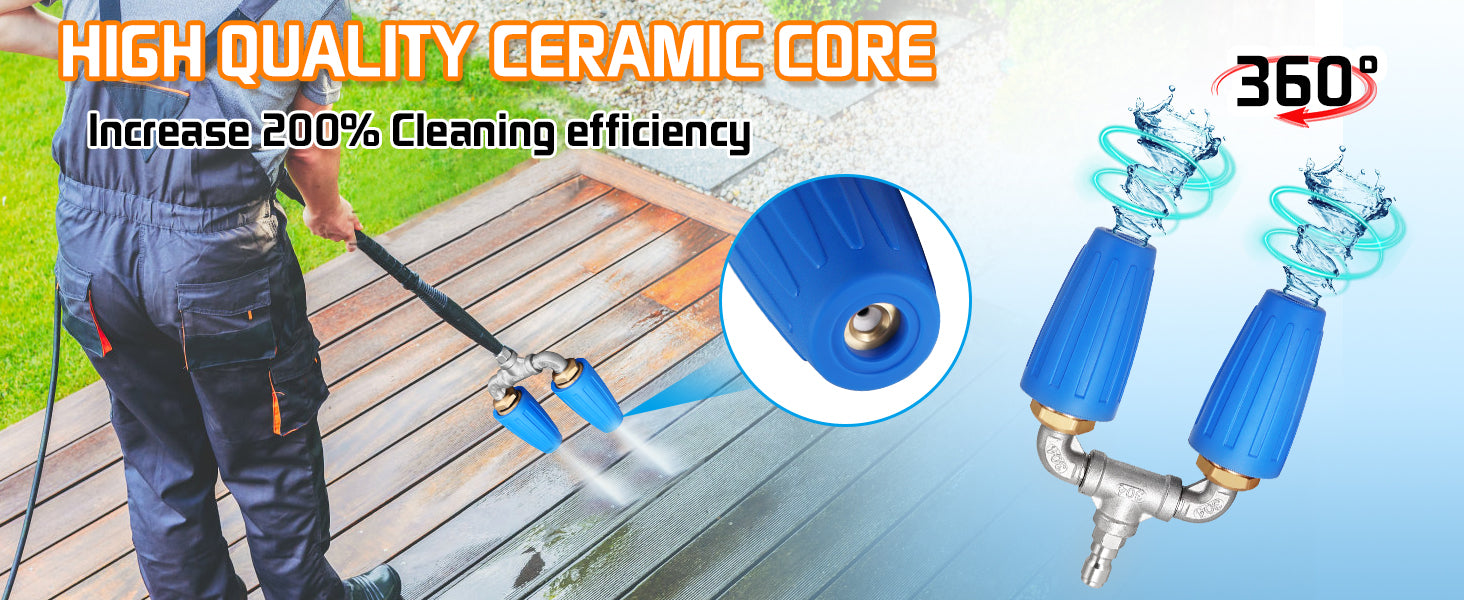 - 【Dual Turbo Nozzle Design】Our upgraded dual high-pressure washer turbo nozzle with two 360° rotating nozzles, greatly increases the flow of water sprayed out, and expands the cleaning range, effectively save your time and energy, make your cleaning work effortlessly.