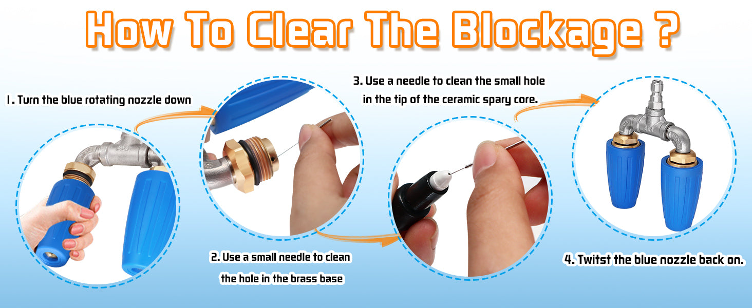 - 【Noted】If the pressure washer turbo nozzle can't work as well as before, please clean the blockage with a needle(included), most issues can be solved by cleaning it.