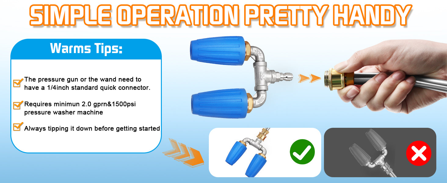 - 【Metal & Rubber Construction】 Dual turbo nozzle for pressure washer is constructed from strong metal material and blue rubber no-slip grip, this twin turbo nozzle is built to withstand heavy-duty use and resist corrosion, ensuring long-term reliability and operability.